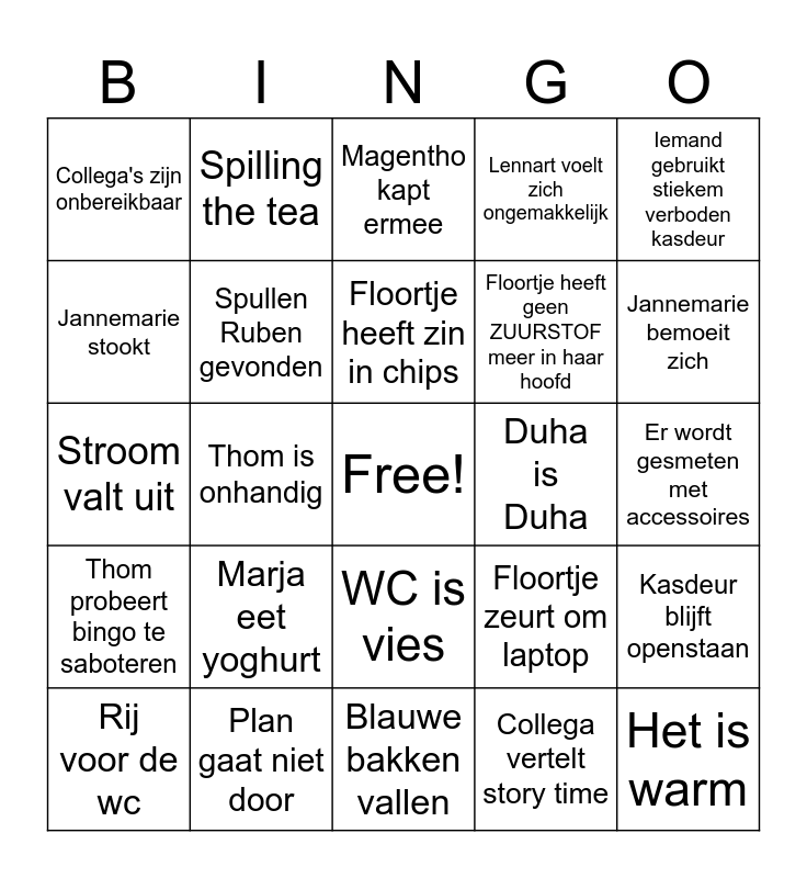 This bingo card has a free space and 25 words: Marja eet yoghurt, Blauwe bakken vallen, Floortje heeft zin in chips, Rij voor de wc, Iemand gebruikt stiekem verboden kasdeur, Collega's zijn onbereikbaar, Jannemarie stookt, Spilling the tea, Duha is Duha, WC is vies, Floortje heeft geen ZUURSTOF meer in haar hoofd, Stroom valt uit, Floortje zeurt om laptop, Kasdeur blijft openstaan, Spullen Ruben gevonden, Jannemarie maakt gebruik van haar MOK, Er wordt gesmeten met accessoires, Magentho kapt ermee, Jannemarie bemoeit zich, Thom is onhandig, Het is warm, Plan gaat niet door, Thom probeert bingo te saboteren, Lennart voelt zich ongemakkelijk and Collega vertelt story time.