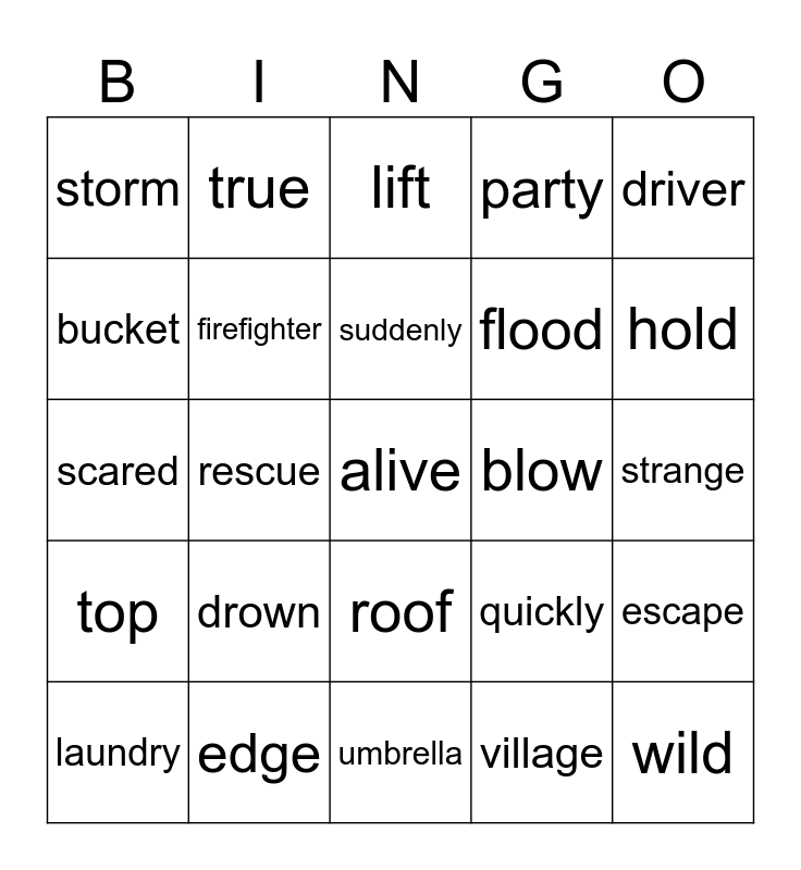 This bingo card has a free space and 24 words: drown, edge, suddenly, laundry, driver, storm, bucket, true, blow, roof, flood, scared, quickly, escape, firefighter, village, strange, lift, hold, rescue, wild, top, party and umbrella.