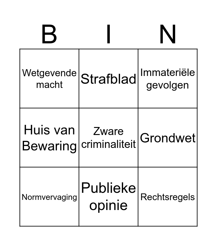 This bingo card has 9 words: Normvervaging, Immateriële gevolgen, Strafblad, Huis van Bewaring, Wetgevende macht, Grondwet, Zware criminaliteit, Rechtsregels and Publieke opinie.