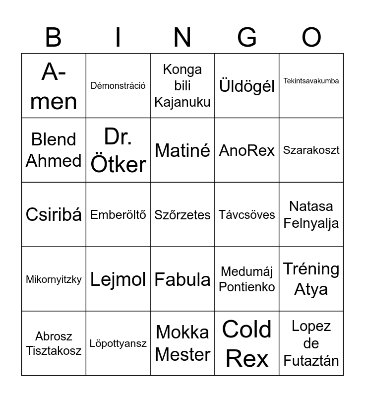 This bingo card has a free space and 24 words: Lejmol, Löpottyansz, Matiné, Abrosz Tisztakosz, Tekintsavakumba, A-men, Blend Ahmed, Démonstráció, Távcsöves, Fabula, AnoRex, Csiribá, Medumáj Pontienko, Tréning Atya, Dr. Ötker, Cold Rex, Natasa Felnyalja, Konga bili Kajanuku, Szarakoszt, Emberöltő, Lopez de Futaztán, Mikornyitzky, Üldögél and Mokka Mester.