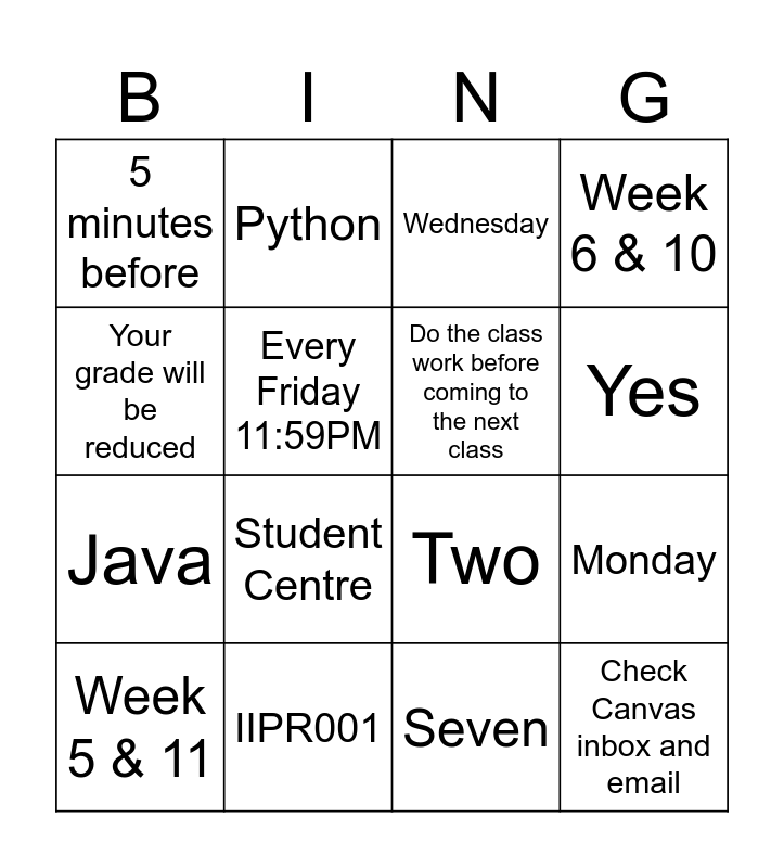 This bingo card has 16 words: IIPR001, Monday, Wednesday, 5 minutes before, Java, Python, Two, Seven, Your grade will be reduced, Every Friday 11:59PM, Week 5 & 11, Week 6 & 10, Student Centre, Yes, Do the class work before coming to the next class and Check Canvas inbox and email.