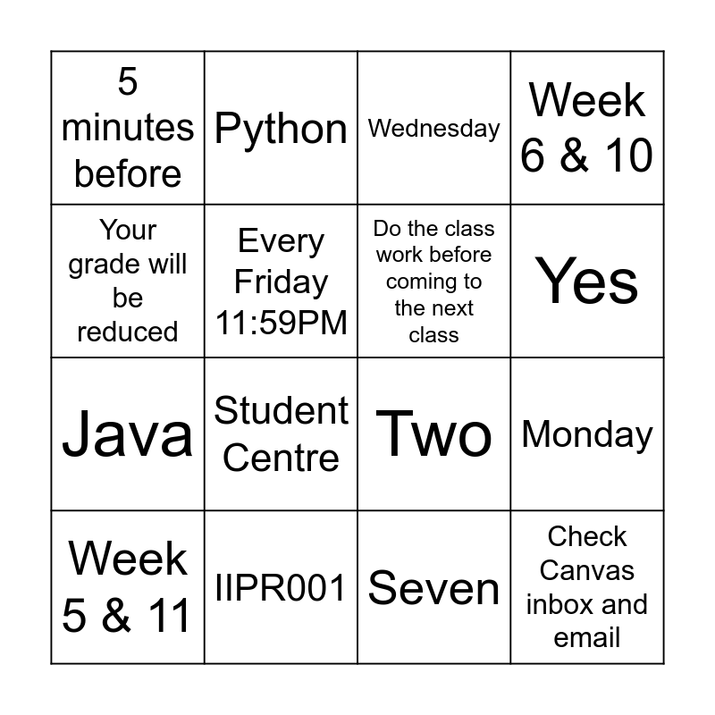 This bingo card has 16 words: IIPR001, Monday, Wednesday, 5 minutes before, Java, Python, Two, Seven, Your grade will be reduced, Every Friday 11:59PM, Week 5 & 11, Week 6 & 10, Student Centre, Yes, Do the class work before coming to the next class and Check Canvas inbox and email.