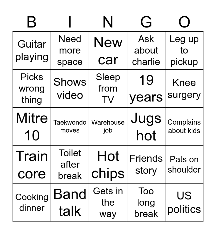 This bingo card has a free space and 24 words: Toilet after break, Band talk, Sleep from TV, Cooking dinner, Leg up to pickup, Guitar playing, Picks wrong thing, Need more space, Jugs hot, Hot chips, 19 years, Mitre 10, Friends story, Pats on shoulder, Shows video, Too long break, Complains about kids, New car, Knee surgery, Taekwondo moves, US politics, Train core, Ask about charlie and Gets in the way.