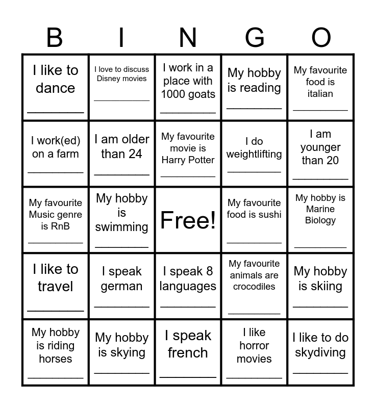 This bingo card has a free space and 24 words: I speak german ________, My hobby is skying ________, My favourite movie is Harry Potter __________, My hobby is riding horses _________, My favourite food is italian __________, I like to dance _______, I work(ed) on a farm _________, I love to discuss Disney movies _____________, My favourite food is sushi __________, I speak 8 languages ________, I do weightlifting _________, My favourite Music genre is RnB __________, My favourite animals are crocodiles __________, My hobby is skiing ________, I am older than 24 ________, I like horror movies _________, My hobby is Marine Biology __________, I work in a place with 1000 goats _________, I am younger than 20 _________, My hobby is swimming ________, I like to do skydiving ________, I like to travel _______, My hobby is reading ________ and I speak french _______.