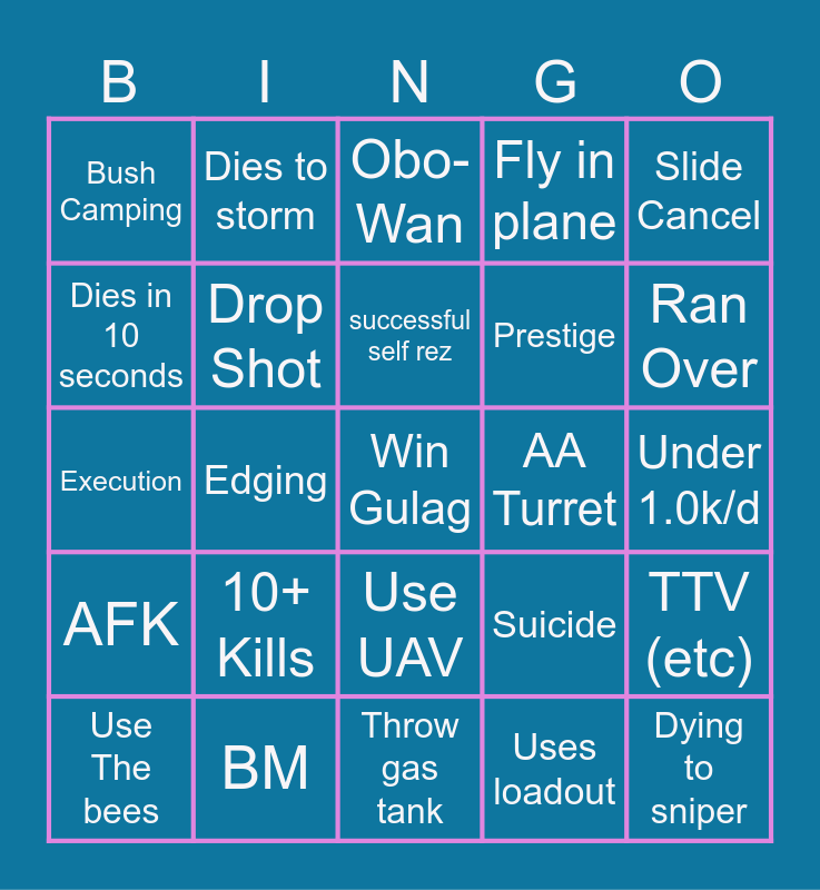 This bingo card has a free space and 24 words: 10+ Kills, BM, successful self rez, Use The bees, Slide Cancel, Bush Camping, Dies in 10 seconds, Dies to storm, AA Turret, Use UAV, Prestige, Execution, Suicide, TTV (etc), Drop Shot, Uses loadout, Under 1.0k/d, Obo-Wan, Ran Over, Edging, Dying to sniper, AFK, Fly in plane and Throw gas tank.