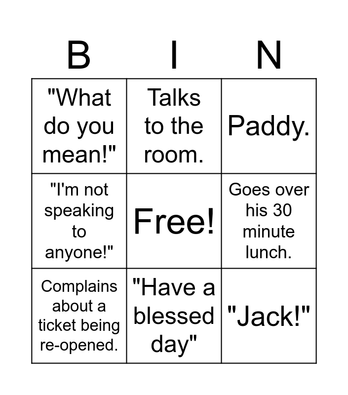 This bingo card has a free space and 11 words: "MEGA", "Have a blessed day", "Jack!", Complains about a ticket being re-opened., Talks to the room., Paddy., Goes over his 30 minute lunch., Complains about taking a call., "I'm not speaking to anyone!", "What do you mean!" and "Womp, womp.".