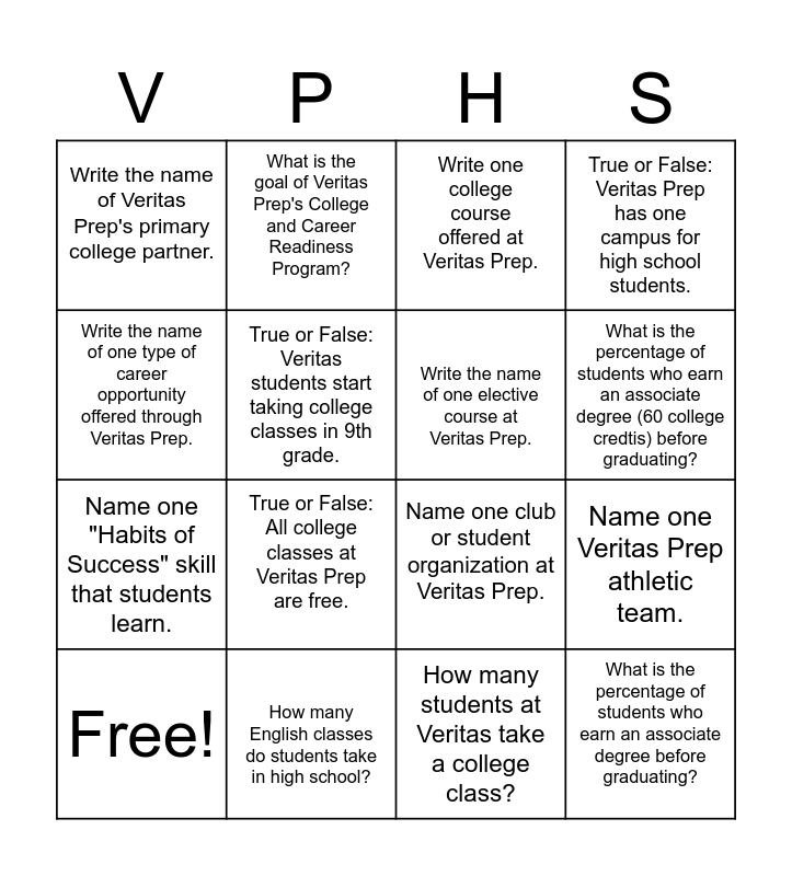 This bingo card has 16 words: How many English classes do students take in high school?, Name one Veritas Prep athletic team., Write one college course offered at Veritas Prep., Write the name of Veritas Prep's primary college partner., Name one "Habits of Success" skill that students learn., What is the goal of Veritas Prep's College and Career Readiness Program?, Name one club or student organization at Veritas Prep., How many students at Veritas take a college class?, Write the name of one type of career opportunity offered through Veritas Prep., True or False: Veritas students start taking college classes in 9th grade., Free!, True or False: Veritas Prep has one campus for high school students., True or False: All college classes at Veritas Prep are free., What is the percentage of students who earn an associate degree (60 college credtis) before graduating?, Write the name of one elective course at Veritas Prep. and What is the percentage of students who earn an associate degree before graduating?.