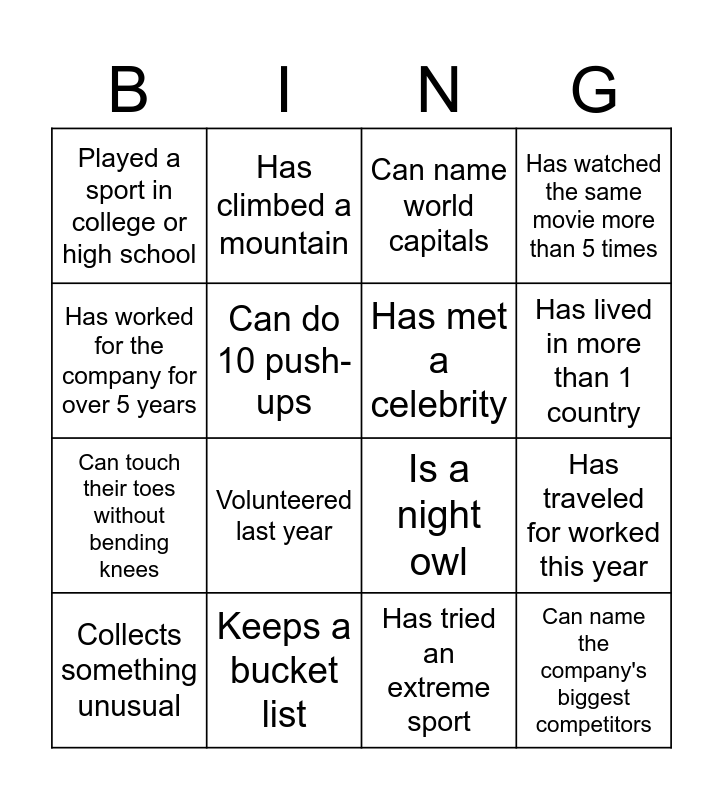 This bingo card has 28 words: Has been to more than 6 countries, Wears a smartwatch daily, Can touch their toes without bending knees, Is a fan of a specific sports team, Can do 10 push-ups, Can name world capitals, Has climbed a mountain, Can name the company's biggest competitors, Keeps a bucket list, Is an early bird, Is a night owl, Has watched the same movie more than 5 times, Can recite a poem from memory, Can play a musical instrument, Volunteered last year, Has eaten at a Michelin-star restaurant, Has a pet, Has met a celebrity, Has lived in more than 1 country, Completed a contract or agreement recently, Played a sport in college or high school, Speaks more than 1 language, Collects something unusual, Has traveled for worked this year, Has tried an extreme sport, Has run a marathon or half-marathon, Has worked for the company for over 5 years and Has trained or onboarded a colleague.