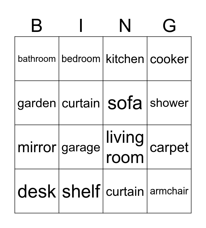 This bingo card has 19 words: living room, lamp, kitchen, armchair, carpet, garden, curtain, bathroom, bedroom, mirror, garage, curtain, sofa, shelf, desk, dining room, cooker, shower and toilet.