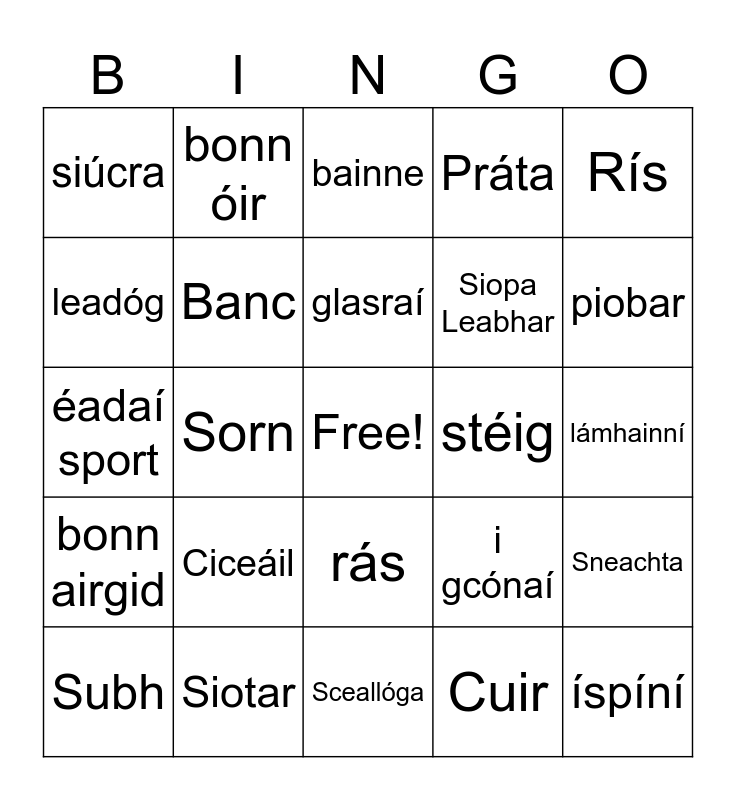 This bingo card has a free space and 56 words: arán, Subh, im, siúcra, Sceallóga, Búistéir, Banc, Fear an Phoist, Siopa Leabhar, Caifé, Práta, Phram, Pancóg, Pláta, ola, Sicín, Rís, Sorn, anraith, íspíní, stéig, bhus, i gcónaí, bainne, plúr, glasraí, píosta, Salann, piobar, Léine, Bríste, Culaith, Stríoca, scaif, lámhainní, leadóg, éadaí sport, feadóg, bonn airgid, bonn óir, rás, ceoil, grúpa, an-tapa, ag canadh, Ciceáil, Siotar, Méara, Cúl, Rith, Cuir, Múinteoir, Chuala mé, Cispeall, Sneachta and An ghrian.