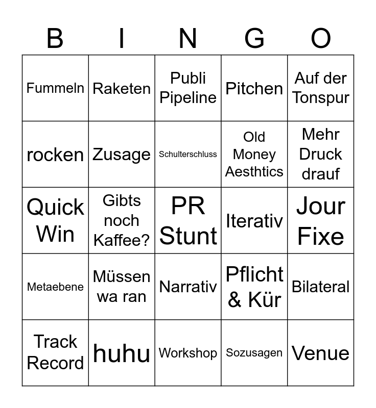 This bingo card has a free space and 24 words: Müssen wa ran, huhu, Schulterschluss, Track Record, Auf der Tonspur, Fummeln, rocken, Raketen, Iterativ, Narrativ, Old Money Aesthtics, Quick Win, Pflicht & Kür, Bilateral, Zusage, Sozusagen, Jour Fixe, Publi Pipeline, Mehr Druck drauf, Gibts noch Kaffee?, Venue, Metaebene, Pitchen and Workshop.