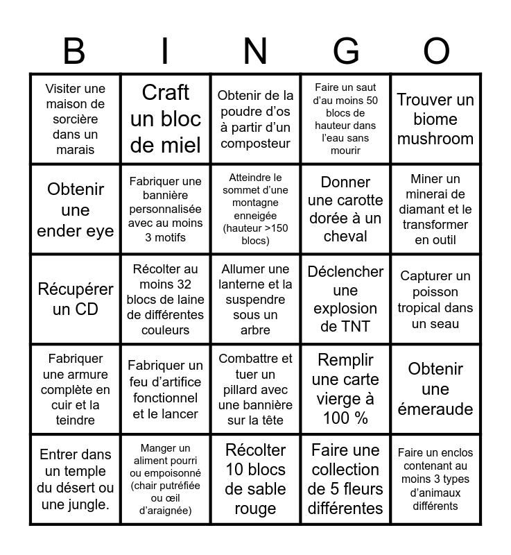 This bingo card has 25 words: Fabriquer un feu d’artifice fonctionnel et le lancer, Récolter 10 blocs de sable rouge, Atteindre le sommet d’une montagne enneigée (hauteur >150 blocs), Entrer dans un temple du désert ou une jungle., Trouver un biome mushroom, Visiter une maison de sorcière dans un marais, Obtenir une ender eye, Craft un bloc de miel, Déclencher une explosion de TNT, Combattre et tuer un pillard avec une bannière sur la tête, Donner une carotte dorée à un cheval, Récupérer un CD, Remplir une carte vierge à 100 %, Obtenir une émeraude, Fabriquer une bannière personnalisée avec au moins 3 motifs, Faire un enclos contenant au moins 3 types d’animaux différents, Capturer un poisson tropical dans un seau, Obtenir de la poudre d’os à partir d’un composteur, Miner un minerai de diamant et le transformer en outil, Récolter au moins 32 blocs de laine de différentes couleurs, Allumer une lanterne et la suspendre sous un arbre, Manger un aliment pourri ou empoisonné (chair putréfiée ou œil d’araignée), Fabriquer une armure complète en cuir et la teindre, Faire un saut d’au moins 50 blocs de hauteur dans l’eau sans mourir and Faire une collection de 5 fleurs différentes.