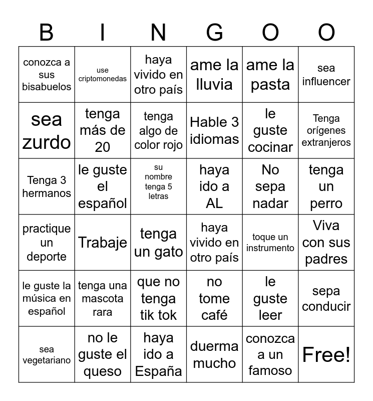 This bingo card has 42 words: conozca a un famoso, tenga más de 20, sepa conducir, No sepa nadar, Viva con sus padres, Trabaje, Tenga 3 hermanos, sea alérgico, haya vivido en otro país, tenga un perro, su nombre tenga 5 letras, Hable 3 idiomas, Tenga orígenes extranjeros, ame la pasta, no le guste el queso, practique un deporte, sepa conducir, le guste cocinar, Free!, use criptomonedas, sea influencer, que no tenga tik tok, le guste la música en español, conozca a sus bisabuelos, haya perdido sus llaves, sea vegetariano, tenga algo de color rojo, le guste bailar, tenga una mascota rara, le guste leer, tenga ojos verdes, haya ido a AL, sea zurdo, toque un instrumento, haya ido a España, tenga un gato, haya vivido en otro país, le guste el español, no tome café, duerma mucho, ame la lluvia and cumpla años pronto.