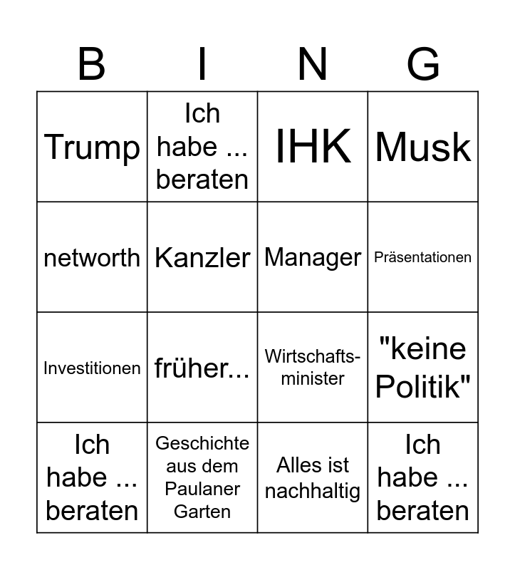 This bingo card has 17 words: Alles ist nachhaltig, Ich habe ... beraten, IHK, Trump, früher..., Musk, "keine Politik", Manager, Präsentationen, Kanzler, Geschichte aus dem Paulaner Garten, Wirtschafts-minister, networth, Ich habe ... beraten, Investitionen, seine Unternehmen and Ich habe ... beraten.