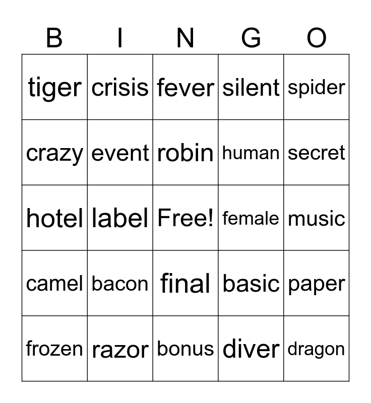 This bingo card has a free space and 24 words: bacon, razor, robin, frozen, spider, tiger, crazy, crisis, female, final, human, hotel, basic, paper, event, diver, music, fever, secret, label, dragon, camel, silent and bonus.