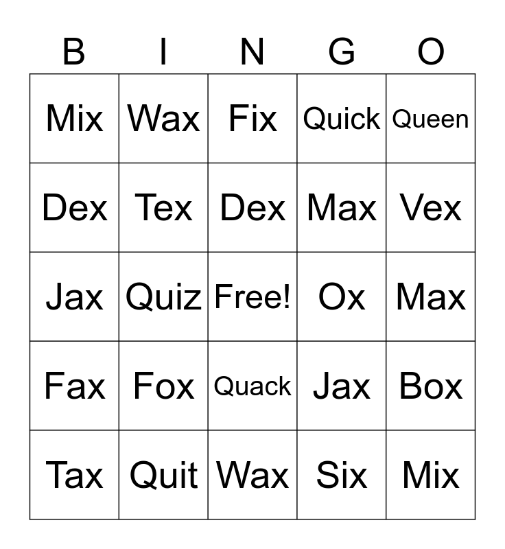 This bingo card has a free space and 24 words: Fox, Quit, Dex, Tax, Queen, Mix, Dex, Wax, Ox, Quack, Max, Jax, Jax, Box, Tex, Six, Max, Fix, Vex, Quiz, Mix, Fax, Quick and Wax.