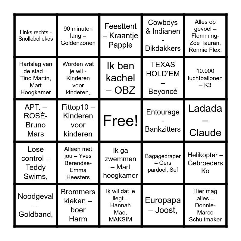 This bingo card has a free space and 34 words: Anne- Fleur vakantie- Roxy Dekker,, Europapa – Joost,, Terug in de tijd – Yves Berendse,, Beautiful things – Benson Boone,, Lose control – Teddy Swims,, Worden wat je wil - Kinderen voor kinderen,, Alles op gevoel – Flemming-Zoë Tauran, Ronnie Flex,, Noodgeval – Goldband,, 90 minuten lang – Goldenzonen, Happy – Pharrell Williams, Ik ben kachel – OBZ, Feesttent – Kraantje Pappie, Vluchtstrook – Kris Kross Amsterdam- Antoon- Sigourney, Ga dan! – Roxy Dekker, Entourage - Bankzitters, 10.000 luchtballonen – K3, Brommers kieken – boer Harm, APT. – ROSÉ- Bruno Mars, Alleen met jou – Yves Berendse- Emma Heesters, Bagagedrager – Gers pardoel, Sef, Ik ga zwemmen – Mart hoogkamer, Viva Hollandia – Wolter Kroes, Links rechts -Snollebollekes, Ladada – Claude, Ik wil dat je liegt – Hannah Mae, MAKSIM, Hier mag alles – Donnie- Marco Schuitmaker, Cowboys & Indianen - Dikdakkers, Shake it off – Taylor Swift, TEXAS HOLD’EM – Beyoncé, Hartslag van de stad – Tino Martin, Mart Hoogkamer, Amsterdam - FLEMMING, Fittop10 – Kinderen voor kinderen, Helikopter – Gebroeders Ko and Kabouterdans – Kabouter Plop.