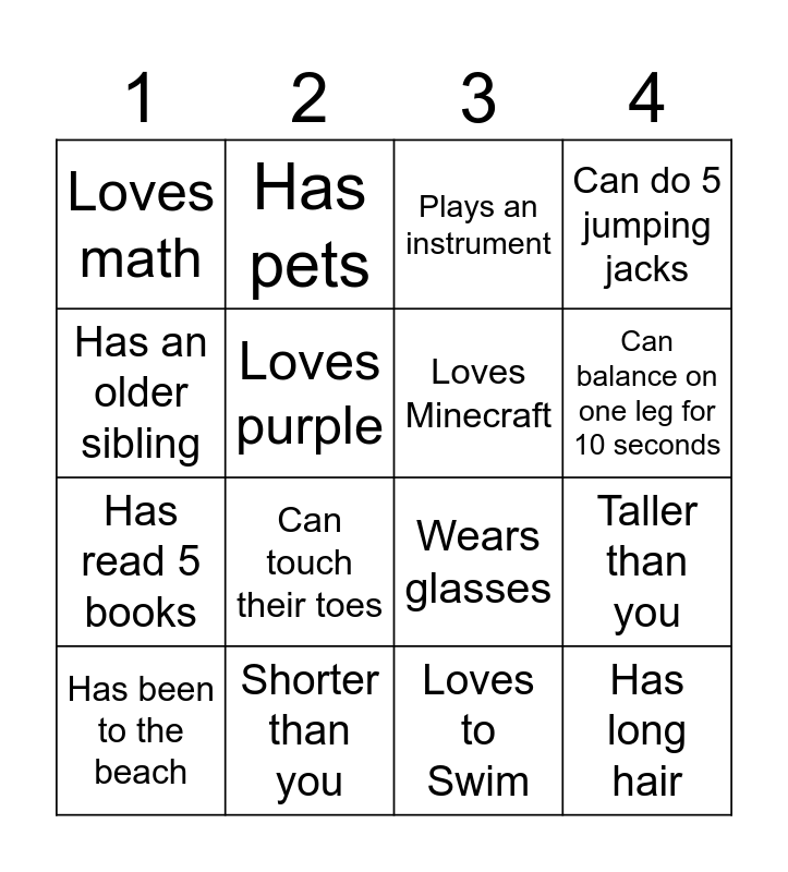 This bingo card has 16 words: Shorter than you, Taller than you, Plays an instrument, Loves math, Has read 5 books, Has pets, Wears glasses, Loves to Swim, Has an older sibling, Loves purple, Has been to the beach, Can do 5 jumping jacks, Can touch their toes, Can balance on one leg for 10 seconds, Loves Minecraft and Has long hair.