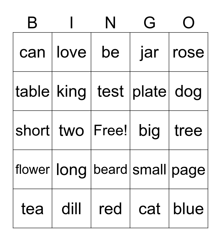 This bingo card has a free space and 29 words: tea, me, two, for, can, be, king, long, big, dill, tree, blue, red, cat, dog, pig, beard, flower, rose, short, small, cup, plate, table, jar, love, page, test and glass.