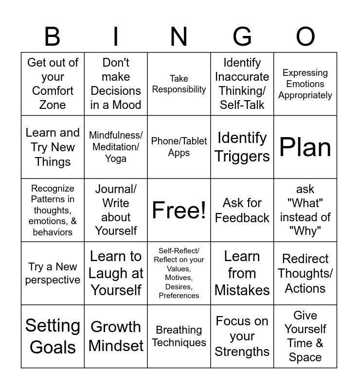 This bingo card has a free space and 24 words: Setting Goals, Learn to Laugh at Yourself, Phone/Tablet Apps, Focus on your Strengths, Expressing Emotions Appropriately, Get out of your Comfort Zone, Don't make Decisions in a Mood, Take Responsibility, Ask for Feedback, ask "What" instead of "Why", Recognize Patterns in thoughts, emotions, & behaviors, Mindfulness/ Meditation/ Yoga, Learn from Mistakes, Redirect Thoughts/ Actions, Learn and Try New Things, Growth Mindset, Breathing Techniques, Identify Inaccurate Thinking/ Self-Talk, Plan, Try a New perspective, Journal/ Write about Yourself, Self-Reflect/ Reflect on your Values, Motives, Desires, Preferences, Identify Triggers and Give Yourself Time & Space.
