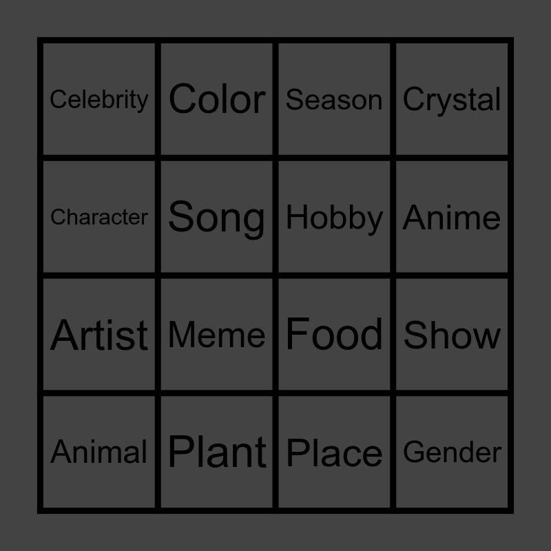 This bingo card has 16 words: Animal, Plant, Season, Crystal, Character, Color, Food, Show, Celebrity, Song, Place, Anime, Artist, Meme, Hobby and Gender.