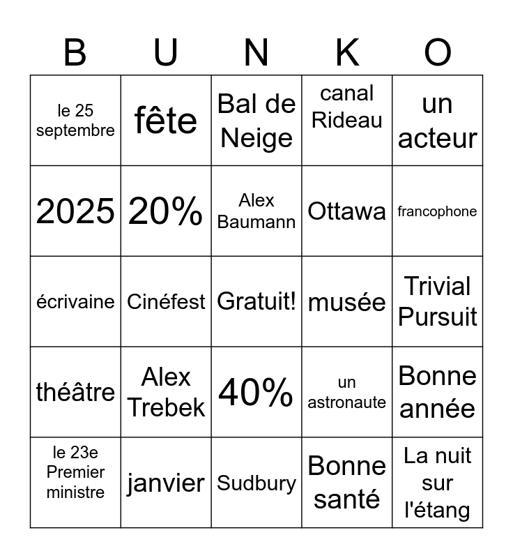 This bingo card has a free space and 28 words: Bonne année, Welland, Ottawa, Bonne santé, 2025, Bal de Neige, fête, théâtre, musée, le 23e Premier ministre, écrivaine, canal Rideau, janvier, Sudbury, francophone, 37%, Alex Trebek, 20%, Alex Baumann, 40%, le 25 septembre, Franco-Ontarien, La nuit sur l'étang, Cinéfest, Trivial Pursuit, un astronaute, un acteur and Président des Blue Jays de Toronto.