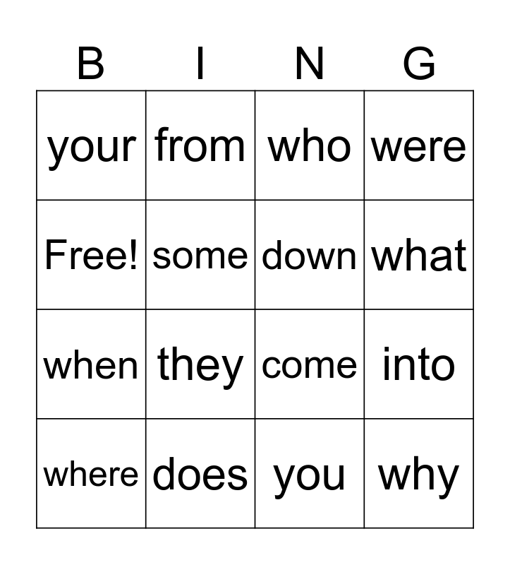 This bingo card has 16 words: does, into, who, your, when, from, come, you, Free!, some, where, were, they, what, down and why.