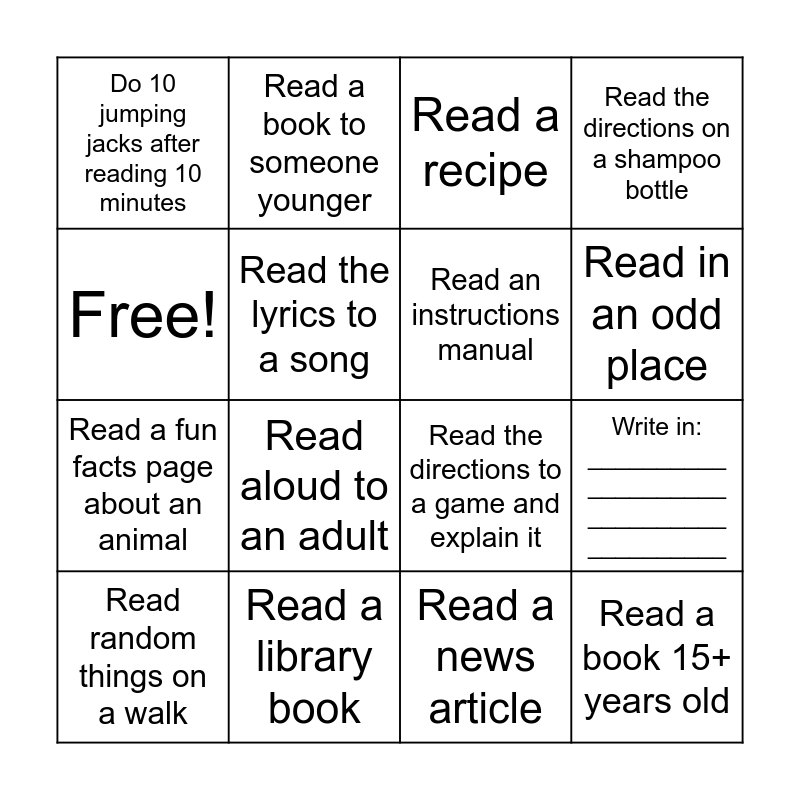 This bingo card has 16 words: Read a library book, Write in: __________ __________ __________ __________, Read a recipe, Do 10 jumping jacks after reading 10 minutes, Read a fun facts page about an animal, Read a book to someone younger, Read the directions to a game and explain it, Read a news article, Free!, Read the lyrics to a song, Read random things on a walk, Read the directions on a shampoo bottle, Read aloud to an adult, Read in an odd place, Read an instructions manual and Read a book 15+ years old.