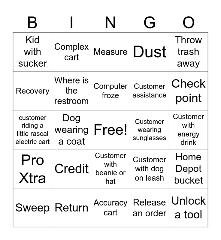 This bingo card has a free space and 29 words: Sweep, Grumpy customer, Dog wearing a coat, Cart run, Kid with sucker, Measure, Where is the restroom, Credit, Customer wearing sunglasses, Return, Customer with energy drink, Unlock a tool, Accuracy cart, Release an order, Check point, Curbside (Hear it or Get it), Customer with beanie or hat, Pro Xtra, Throw trash away, customer riding a little rascal electric cart, Customer with dog on leash, Tiny dog in cart, Customer assistance, Recovery, Dust, Complex cart, Home Depot bucket, Computer froze and Taco cart.