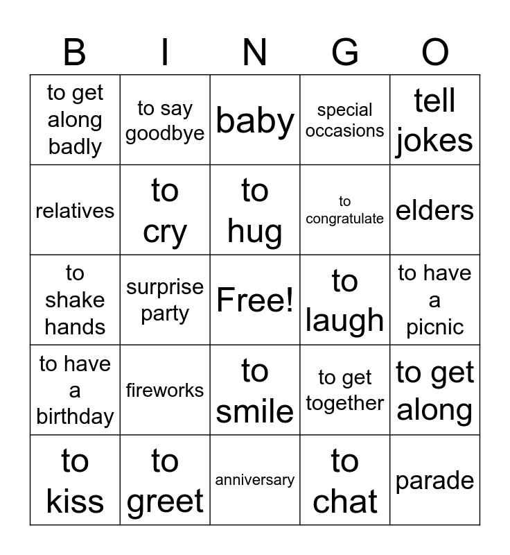 This bingo card has a free space and 24 words: fireworks, to greet, to hug, to kiss, tell jokes, to get along badly, relatives, to say goodbye, to laugh, to smile, to congratulate, to shake hands, to get together, to get along, to cry, to chat, to have a picnic, baby, elders, surprise party, parade, to have a birthday, special occasions and anniversary.