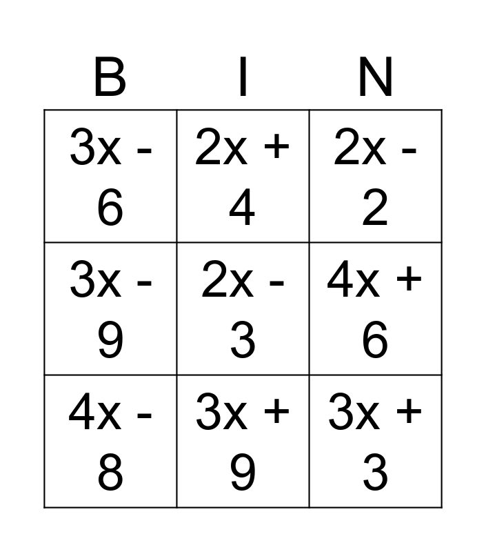 This bingo card has 20 words: 2x + 2, x + 1, 2x - 2, 2x + 3, 3x + 6, 2x - 3, 3x - 3, 3x - 6, 3x + 3, 2x + 4, 4x + 4, 4x + 8, 4x + 6, 4x - 4, 4x - 8, 4x - 6, 3x + 9, 3x - 9, 6x + 6 and 6x + 3.