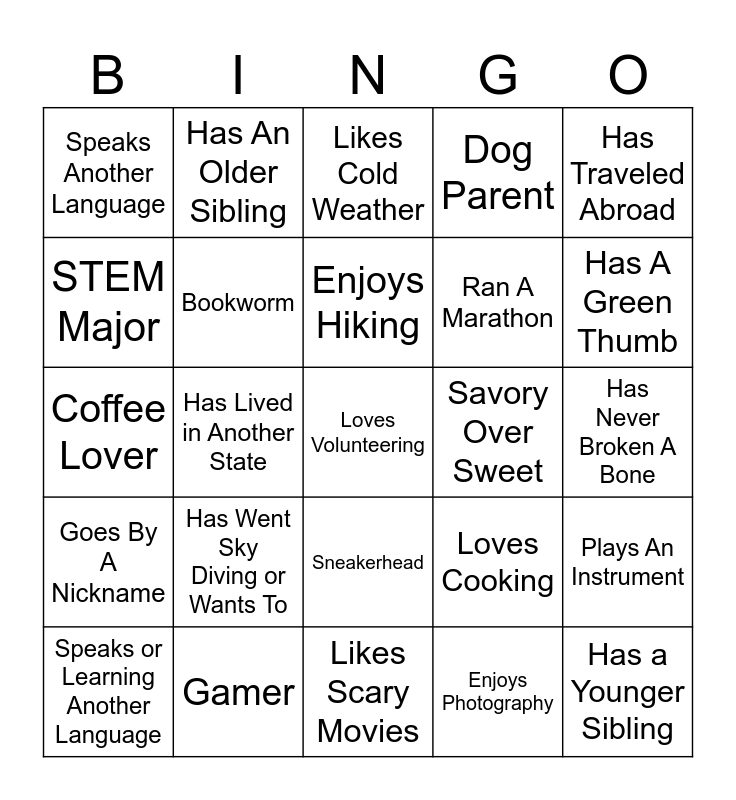 This bingo card has 35 words: Has/Had Braces, Likes Blue Cheese, Cat Lover, Bookworm, Sneakerhead, Dog Parent, STEM Major, Sorority/ Fraternity Member, Enjoys Hiking, Can Sew, Knit, or Crochet, Coffee Lover, Has Traveled Abroad, Sweet Over Savory, Fitness Fanatic, Speaks Another Language, Savory Over Sweet, Enjoys Photography, Has Lived in Another State, Goes By A Nickname, Loves Volunteering, Loves Cooking, Speaks or Learning Another Language, Plays An Instrument, Gamer, Likes Cold Weather, Has A Green Thumb, Has a Younger Sibling, Is An Only Child, Ran A Marathon, Has Never Broken A Bone, Likes Fishing, Likes Scary Movies, Has Went Sky Diving or Wants To, Has An Older Sibling and Has Met A Celebrity.