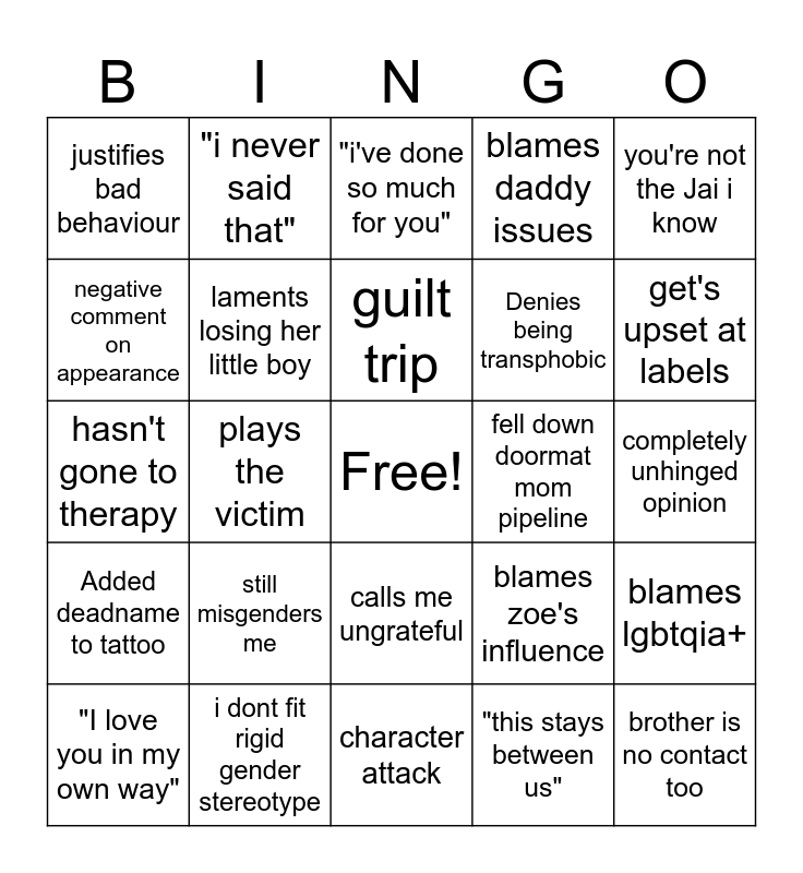 This bingo card has a free space and 24 words: "I love you in my own way", still misgenders me, guilt trip, "this stays between us", you're not the Jai i know, justifies bad behaviour, "i never said that", "i've done so much for you", fell down doormat mom pipeline, completely unhinged opinion, hasn't gone to therapy, laments losing her little boy, blames zoe's influence, blames lgbtqia+, negative comment on appearance, i dont fit rigid gender stereotype, character attack, blames daddy issues, get's upset at labels, Added deadname to tattoo, plays the victim, calls me ungrateful, Denies being transphobic and brother is no contact too.