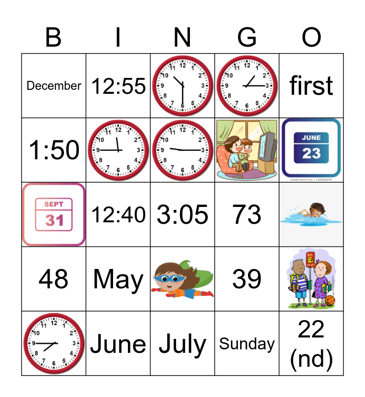 This bingo card has 27 images, a free space and 47 words: 31(st), 23(rd), 2:55, twelfth, 1:50, 12:40, 12:55, 22 (nd), 9:30, 1:15, 1:45, fifth, 44 (th), first, Monday, Saturday, Wednesday, Friday, Sunday, Second, Third, January, February, July, June, April, September, October, December, November, May, March, August, Fourth, 67, 48, 29, 73, 16, 75, 56, 39, 34, 14, 65, 53 and 28.