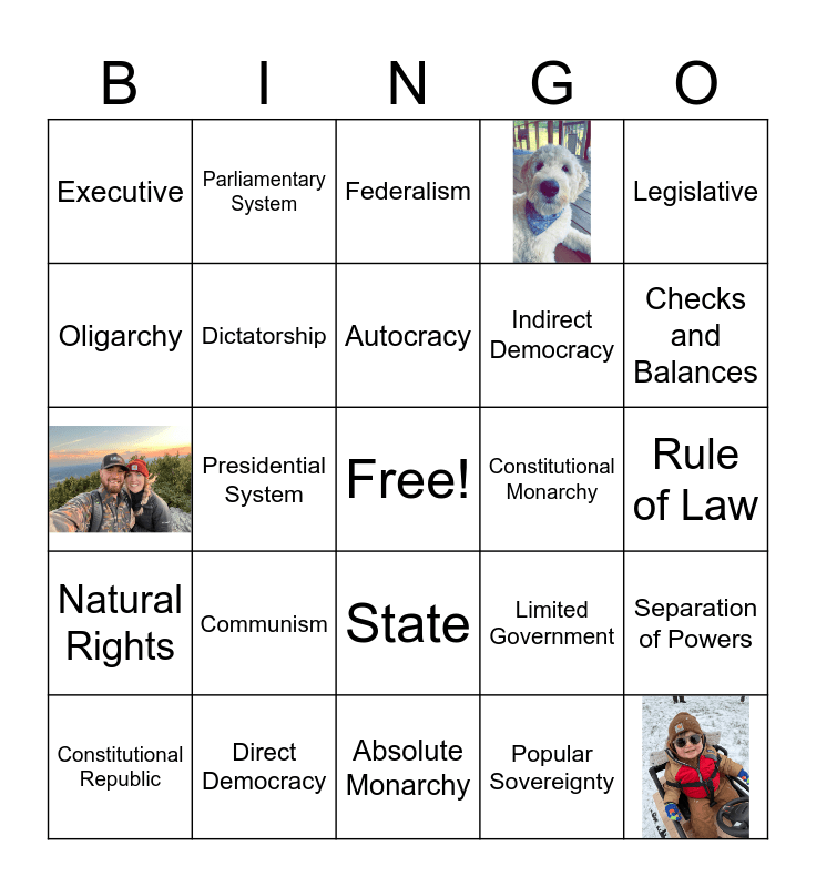 This bingo card has 3 images, a free space and 21 words: Communism, Direct Democracy, Autocracy, Constitutional Republic, Legislative, Executive, Oligarchy, Parliamentary System, Constitutional Monarchy, State, Indirect Democracy, Limited Government, Separation of Powers, Dictatorship, Popular Sovereignty, Rule of Law, Federalism, Checks and Balances, Presidential System, Natural Rights and Absolute Monarchy.