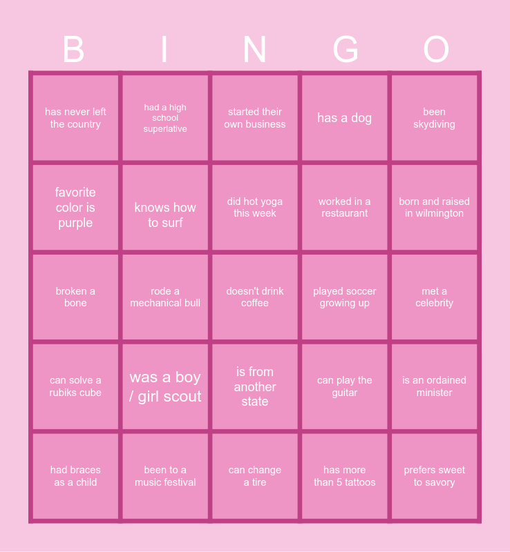 This bingo card has 35 words: favorite holiday is halloween, has blue eyes, has been to hawaii, knows how to surf, is from another state, has a dog, favorite color is purple, has an O2 membership, did hot yoga this week, ran a marathon, broken a bone, been skydiving, free space, has a library card, has never left the country, played soccer growing up, has more than 5 tattoos, rode a mechanical bull, can solve a rubiks cube, doesn't drink coffee, can play the guitar, had braces as a child, is an ordained minister, been to a music festival, started their own business, born and raised in wilmington, prefers sweet to savory, been to Disney, worked in a restaurant, met a celebrity, can snowboard, can change a tire, was a boy / girl scout, had a high school superlative and favorite ice cream flavor is mint chocolate chip.