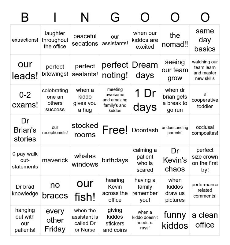 This bingo card has a free space and 55 words: when a kiddo doesn't needs x-rays!, a cooperative toddler, Havre!, extractions!, our receptionists!, no braces, same day basics, no Fridays in the summer, perfect bitewings!, our fish!, our assistants!, perfect size crown on the first try!, occlusal composites!, understanding parents!, hanging out with our patients!, 0 pay walk out-statements, when our kiddos are excited, Dream days, funny kiddos, seeing our team grow, watching our team learn and master new skills, maverick, 1 Dr days, peaceful sedations, successful restoratives, our leads!, stocked rooms, when all of our restoratives show up, 0-2 exams!, when dr brian gets a break to go run, Dr Tedis teaching, Dr Kevin's chaos, performance related comments!, every other Friday, the nomad!!, perfect noting!, Dr brad knowledge, celebrating one an others success, a clean office, whales windows, laughter throughout the office, hearing Kevin across the office, having a family remember you!, being thanked by a parent, when a kiddo gives you a hug, Dr Brian's stories, when the assistant is called Dr or Nurse, calming a patient who is scared, Doordash, perfect sealants!, birthdays, when kiddos draw us pictures, giving kiddos stickers and coins, meeting awesome and amazing family's and kiddos and when a kiddo picks a good movie!.