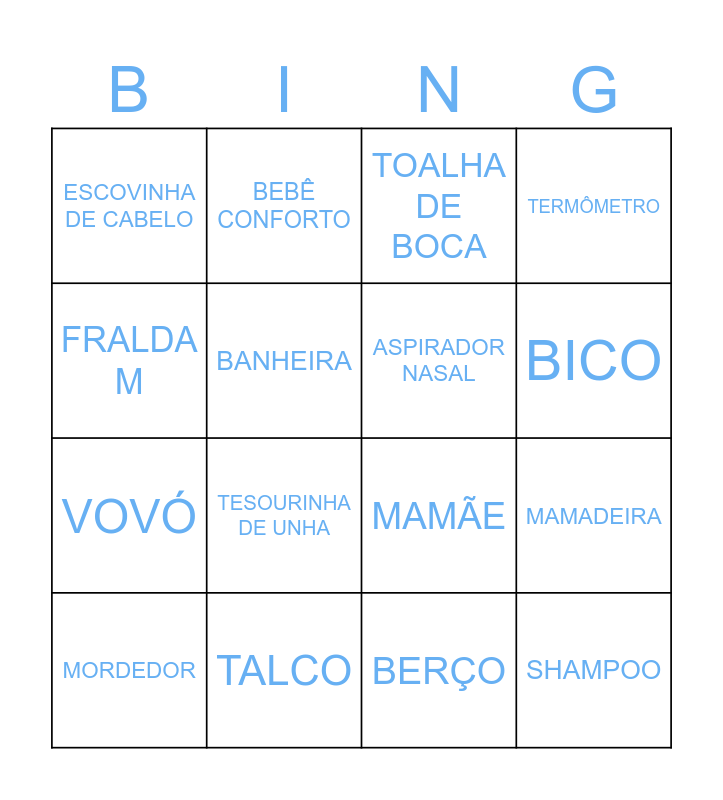 This bingo card has 37 words: Free!, ALGODÃO, TIPTOP, ASPIRADOR NASAL, FRALDA P, BABADOR, BICO, BOLSA MATERNIDADE, FRALDA M, LENÇO UMEDECIDO, MAMADEIRA, TERMÔMETRO, MORDEDOR, BERÇO, BANHEIRA, SHAMPOO, TOALHA DE BANHO, TOALHA DE BOCA, FRALDA RN, TALCO, ESCOVINHA DE CABELO, TESOURINHA DE UNHA, PRENDEDOR DE BICO, CUEIRO, MANTA, CARRINHO DE BEBÊ, BEBÊ CONFORTO, SAÍDA DE MATERNIDADE, MIJÃO, BODY P, BODY M, ANDADOR, MAMÃE, PAPAI, IRMÃOZINHO DAVI, VOVÓ and VOVÔ.