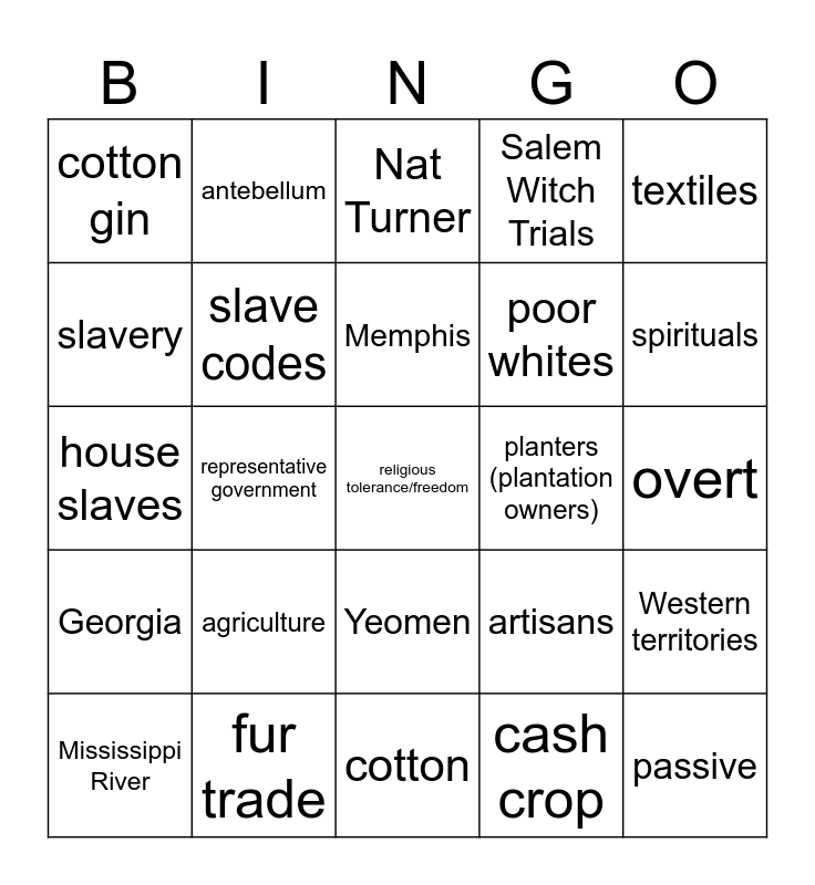 This bingo card has 25 words: agriculture, cotton, Memphis, Mississippi River, textiles, cotton gin, slavery, antebellum, planters (plantation owners), Yeomen, poor whites, house slaves, artisans, Western territories, slave codes, passive, overt, Nat Turner, spirituals, representative government, religious tolerance/freedom, fur trade, Georgia, Salem Witch Trials and cash crop.