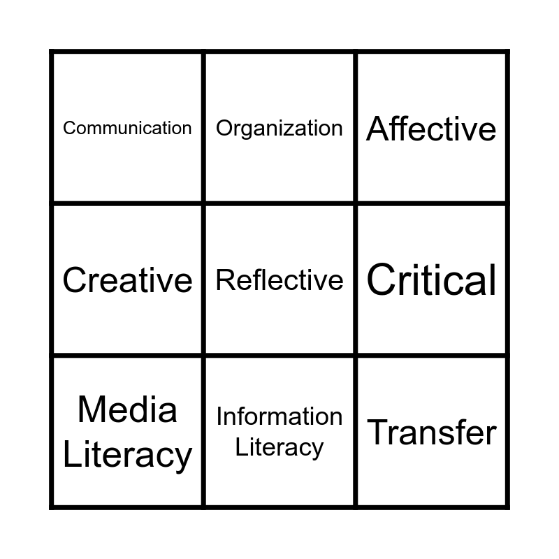 This bingo card has 10 words: Information Literacy, Affective, Communication, Reflective, Creative, Media Literacy, Organization, Collaboration, Critical and Transfer.