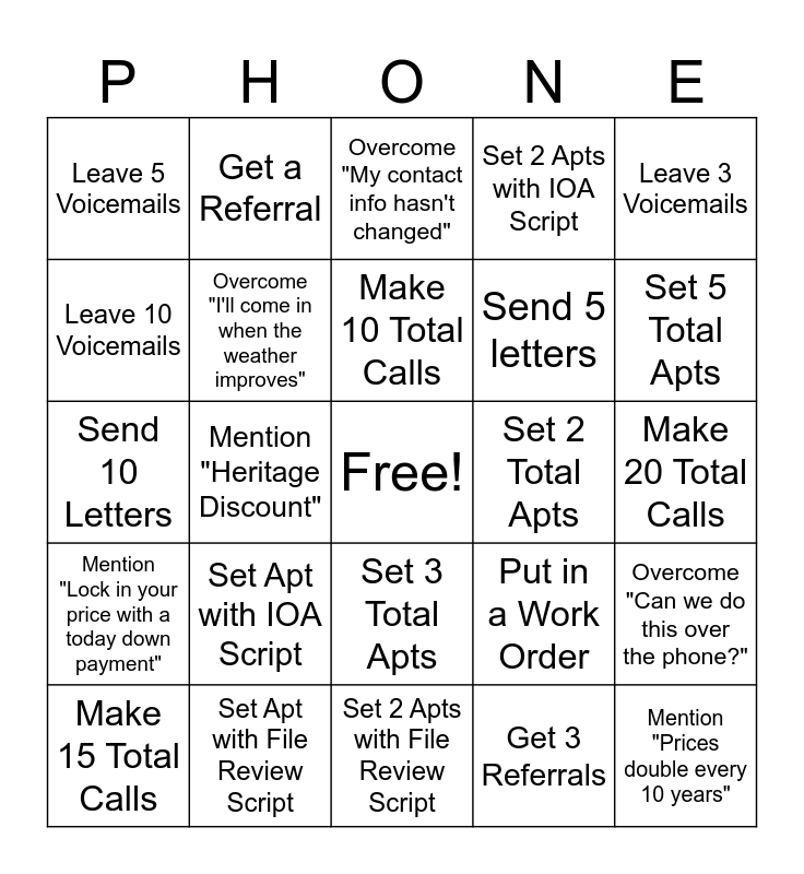 This bingo card has a free space and 24 words: Set Apt with IOA Script, Set Apt with File Review Script, Make 10 Total Calls, Make 15 Total Calls, Leave 3 Voicemails, Leave 5 Voicemails, Leave 10 Voicemails, Get a Referral, Set 2 Total Apts, Set 3 Total Apts, Send 5 letters, Send 10 Letters, Put in a Work Order, Overcome "Can we do this over the phone?", Overcome "I'll come in when the weather improves", Get 3 Referrals, Make 20 Total Calls, Overcome "My contact info hasn't changed", Set 5 Total Apts, Mention "Heritage Discount", Mention "Prices double every 10 years", Mention "Lock in your price with a today down payment", Set 2 Apts with IOA Script and Set 2 Apts with File Review Script.