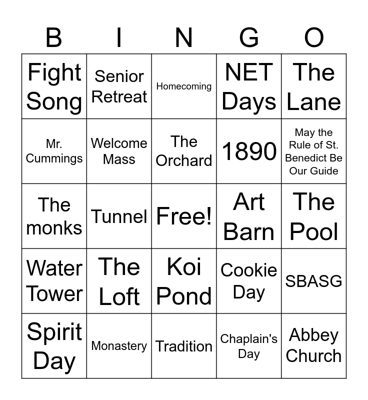 This bingo card has a free space and 29 words: Spirit Day, Bruin Bowl, Tunnel, Senior Farewell Mass, Fight Song, Homecoming, Welcome Mass, The Loft, Art Barn, Monastery, The Pool, Abbey Church, Tradition, Chaplain's Day, May the Rule of St. Benedict Be Our Guide, May the Spirit of St. Bede Stay with Us Forever, Koi Pond, Water Tower, The Lane, The monks, Cookie Day, Br. George Statue, 1890, Mr. Cummings, NET Days, Senior Retreat, SBASG, The Orchard and PSC.