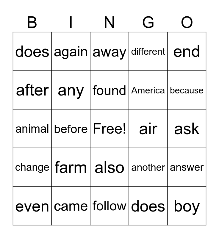 This bingo card has a free space and 25 words: farm, follow, found, even, end, does, after, again, air, also, America, animal, another, answer, any, around, ask, away, because, before, boy, came, change, different and does.