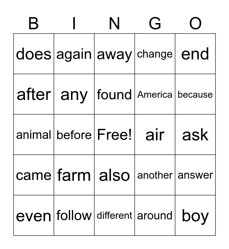 This bingo card has a free space and 24 words: farm, follow, found, even, end, does, after, again, air, also, America, animal, another, answer, any, around, ask, away, because, before, boy, came, change and different.
