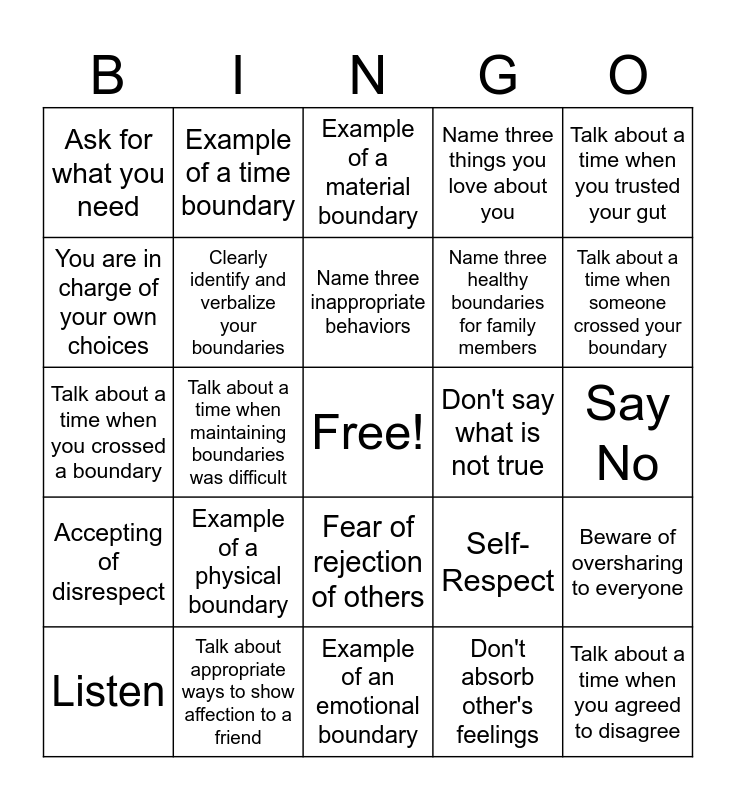 This bingo card has a free space and 24 words: Example of a physical boundary, Talk about appropriate ways to show affection to a friend, Name three inappropriate behaviors, Listen, Talk about a time when you trusted your gut, Ask for what you need, You are in charge of your own choices, Example of a time boundary, Don't say what is not true, Fear of rejection of others, Name three healthy boundaries for family members, Talk about a time when you crossed a boundary, Self-Respect, Beware of oversharing to everyone, Clearly identify and verbalize your boundaries, Don't absorb other's feelings, Say No, Example of a material boundary, Talk about a time when someone crossed your boundary, Talk about a time when maintaining boundaries was difficult, Talk about a time when you agreed to disagree, Accepting of disrespect, Name three things you love about you and Example of an emotional boundary.