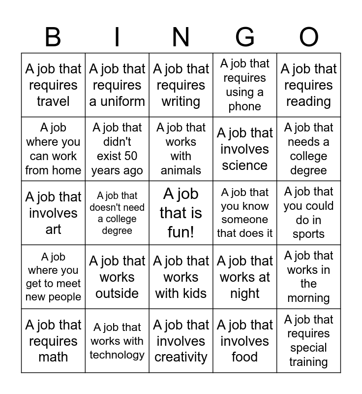 This bingo card has a free space and 24 words: A job that works outside, A job that works with technology, A job that works with animals, A job that requires math, A job that requires reading, A job that requires travel, A job where you can work from home, A job that requires a uniform, A job that you know someone that does it, A job that works with kids, A job that involves science, A job that involves art, A job that works at night, A job that works in the morning, A job that didn't exist 50 years ago, A job that involves food, A job that you could do in sports, A job that requires writing, A job that needs a college degree, A job that doesn't need a college degree, A job that requires special training, A job where you get to meet new people, A job that requires using a phone and A job that involves creativity.