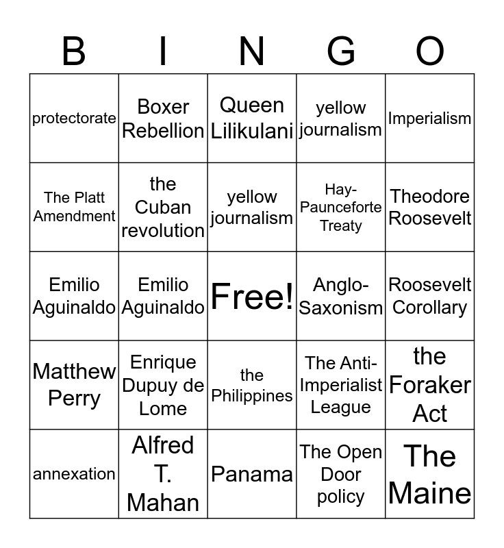 This bingo card has a free space and 24 words: Enrique Dupuy de Lome, Alfred T. Mahan, yellow journalism, annexation, Imperialism, protectorate, The Platt Amendment, Boxer Rebellion, Anglo-Saxonism, the Philippines, Hay-Paunceforte Treaty, Emilio Aguinaldo, The Anti-Imperialist League, the Foraker Act, the Cuban revolution, The Open Door policy, Roosevelt Corollary, Queen Lilikulani, Theodore Roosevelt, Emilio Aguinaldo, The Maine, Matthew Perry, yellow journalism and Panama.