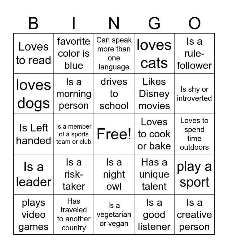This bingo card has a free space and 30 words: Has traveled to another country, Can play a musical instrument, Is a member of a sports team or club, Has a job outside of school, Loves to read, Can speak more than one language, Is a morning person, Is a night owl, Loves to cook or bake, Is a vegetarian or vegan, Loves to spend time outdoors, Is a creative person, Is a good listener, Is a good public speaker, Is shy or introverted, Is outgoing or extroverted, Has a unique talent, Is a leader, Is a risk-taker, Is a rule-follower, Is Left handed, Likes to draw, favorite color is blue, Likes Disney movies, loves dogs, loves cats, play a sport, plays video games, drives to school and rides the bus.
