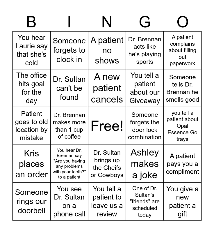 This bingo card has a free space and 24 words: You hear Dr. Brennan say "Are you having any problems with your teeth?" to a patient, You see Dr. Sultan on a phone call, A new patient cancels, Someone rings our doorbell, A patient complains about filling out paperwork, You hear Laurie say that she's cold, The office hits goal for the day, Someone forgets to clock in, Someone forgets the door lock combination, Dr. Sultan brings up the Cheifs or Cowboys, You tell a patient about our Giveaway, Patient goes to old location by mistake, Ashley makes a joke, A patient pays you a compliment, Dr. Sultan can't be found, One of Dr. Sultan's "friends" are scheduled today, you tell a patient about Opal Essence Go trays, A patient no shows, Someone tells Dr. Brennan he smells good, Dr. Brennan makes more than 1 cup of coffee, You give a new patient a gift, Kris places an order, Dr. Brennan acts like he's playing sports and You tell a patient to leave us a review.