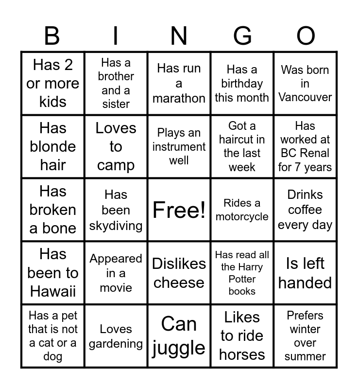 This bingo card has a free space and 24 words: Appeared in a movie, Loves gardening, Plays an instrument well, Has a pet that is not a cat or a dog, Was born in Vancouver, Has 2 or more kids, Has blonde hair, Has a brother and a sister, Rides a motorcycle, Dislikes cheese, Got a haircut in the last week, Has broken a bone, Has read all the Harry Potter books, Is left handed, Loves to camp, Likes to ride horses, Drinks coffee every day, Has run a marathon, Has worked at BC Renal for 7 years, Has been skydiving, Prefers winter over summer, Has been to Hawaii, Has a birthday this month and Can juggle.
